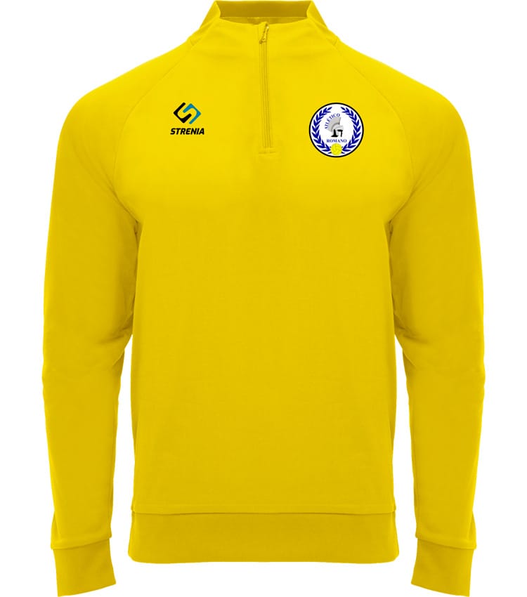 Sudadera de manga ranglan, con interior perchado, cuello con media cremallera y cubrecosturas de refuerzo en su interior a tono. Parte posterior del cuello, puños y bajo en canalé 1×1.